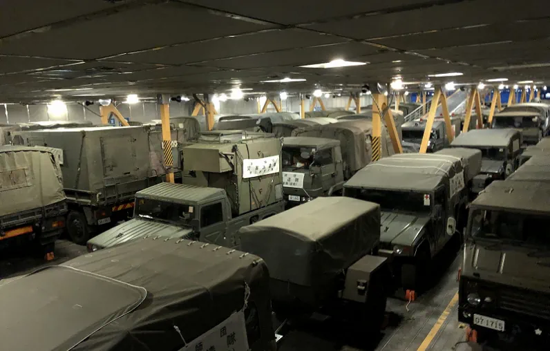 自衛隊の訓練や災害時の緊急輸送など、防衛省の輸送要望に応じて、自衛隊員・車輛の輸送に従事しています。出港前の運航計画や積み付けプランの作成、積み降ろしにおいては港湾代理店とのブリーフィングや船内の車輛誘導、運航中は操船だけでなく隊員の方へのサービス提供まで、安全に輸送するための業務は多岐に渡ります。