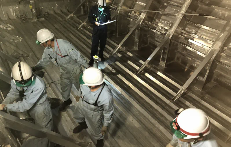 防衛省の輸送所要に即時対応するためナッチャンWorldの保守管理をしています。船陸で連携し、本船の状態を把握して適切な整備計画を策定していますが、入渠などの定期整備に加え、乗組員による日々の点検整備を通じて常時待機態勢を保っています。乗組員は当直を除き、毎日本船至近の自宅から本船へ通い業務に当たっています。